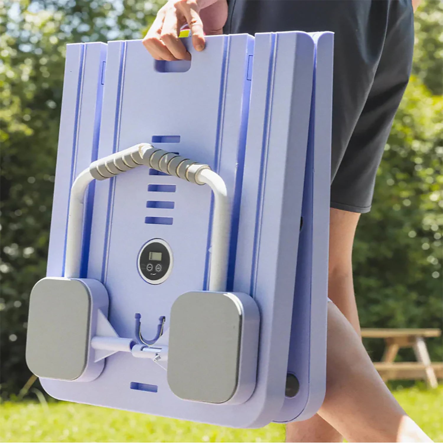 1. Halte die Griffe mit beiden Händen und lege deine Ellenbogen auf die Schutzpolsterung. Positioniere deine Knie auf der beiliegenden Kniematte.